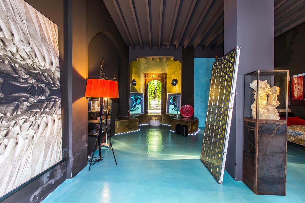 The residence spans 386 m² across two floors and features four bedrooms, a compact kitchen, a terrace, a balcony, and a spacious private courtyard of 213 m² adorned with a lush garden showcasing palm trees and bougainvillaea.